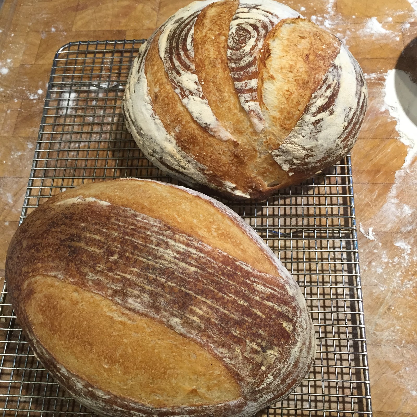 Two Loaves of Sourdough Bread So, I’ve been nurturing this sourdough starter for a few weeks, and yesterday I determined that it was about ready. Today I baked two loaves and I’m pleased with the result. The loaf at the top of the picture was baked at 450 for about 30 minutes, the first 20 minutes under a preheated inverted dutch oven on a baking stone. The dutch oven helps maintain a moist environment. The bottom loaf was baked open at 450 for 20 minutes, temperature reduced to 350 for another 10.